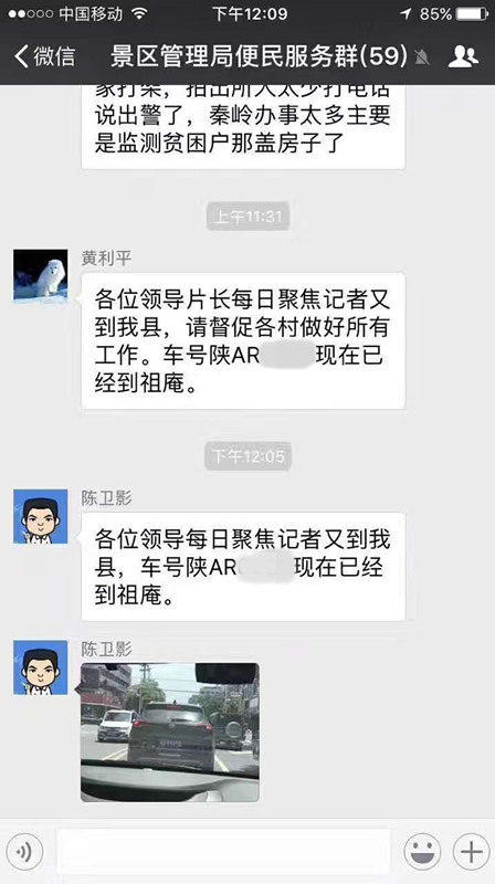 微信群聊天截图可见,“景区管理局便民服务群”中,11时31分,微信名为“黄利平”的用户首先“预警”:“各位领导片长,每日聚焦记者又到我县,请督促各村做好所有工作。车号陕ARXXXX现在已经到祖庵。”半小时后,用户“陈卫影”重复上述信息,并发出疑似正在跟踪、有前车车牌号码的照片。