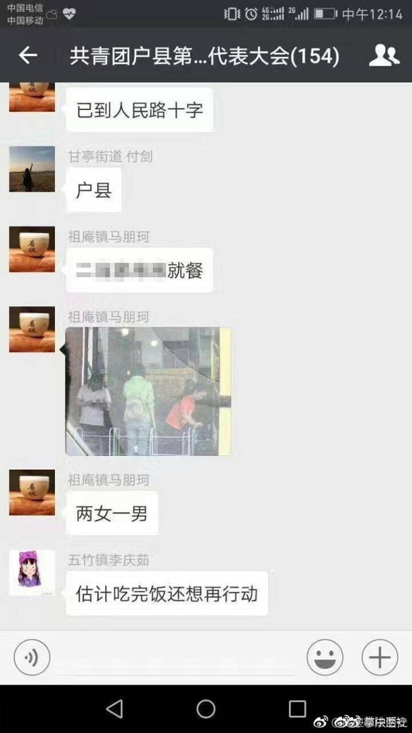而在另一“共青团户县第…代表大会”群聊中,继续有人通报记者行踪。备注名“祖庵镇马朋珂”先后介绍,“已到人民路十字”、“XX就餐”,“两女一男”,还附上餐馆内照片,“五竹镇李庆茹”同时附和“估计吃完饭还想再行动”。此外还有“甘亭街道付剑”复述“户县”。